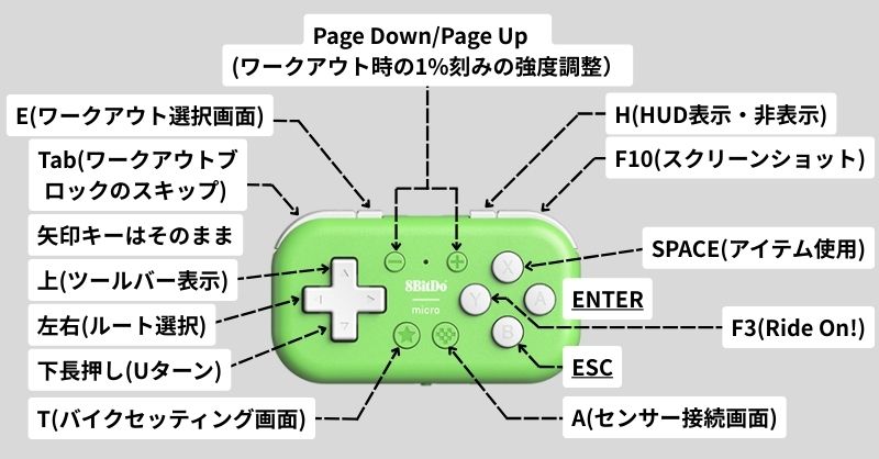 なおバイクセッティング画面やワークアウト選択画面も矢印キーで操作できますが手元にマウスがある人はマウスの方が早いです。