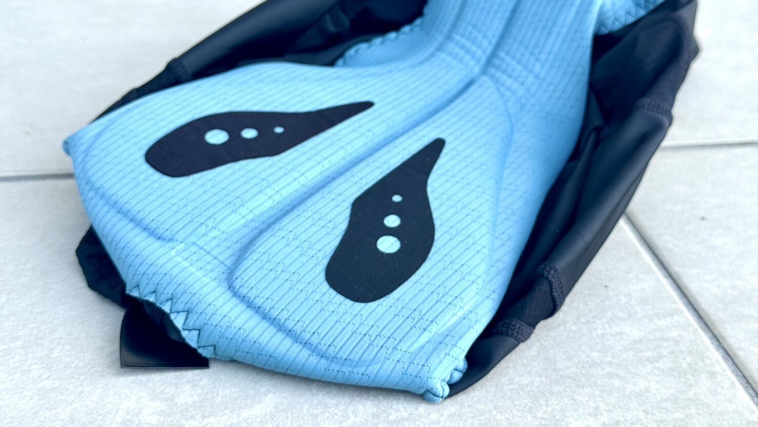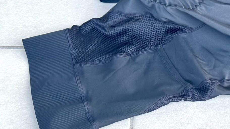 背中とビブストラップはメッシュ生地、ショーツ部も一部通気性の良い生地が配置された凝った作り。