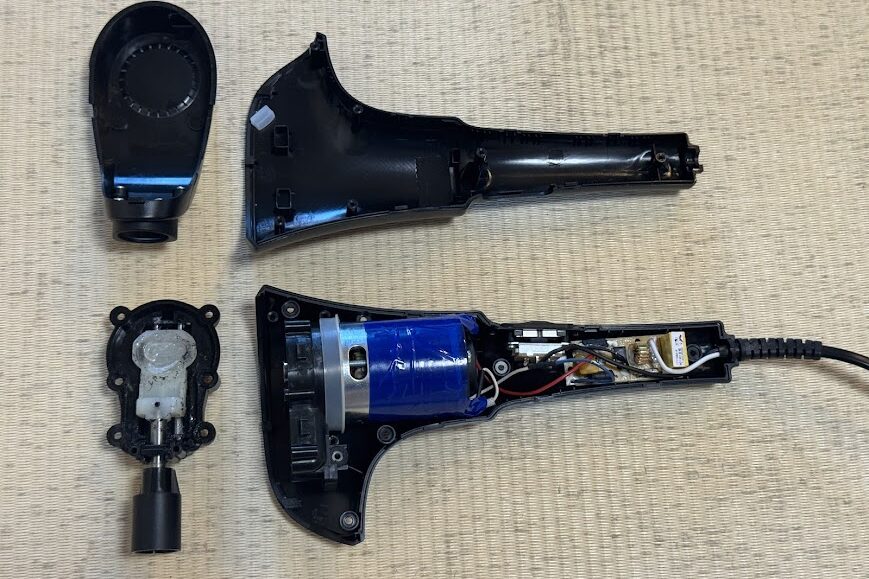 分解したところ、モーターの回転を前後のストロークに変換する白いエラストマー樹脂のような部品が変形してしまっていることが原因。