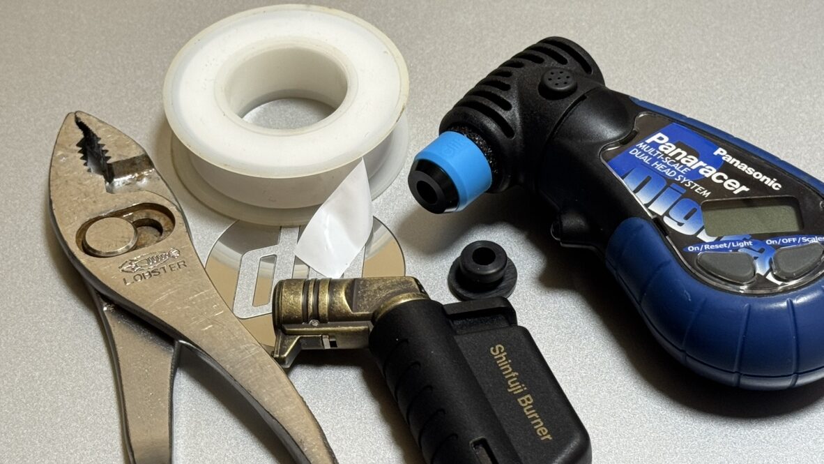 3.逆回転させてクリックポンプアダプターを一度抜き、水道用のシールテープを半分幅に切って2周巻いて再度ねじ込んで完成。