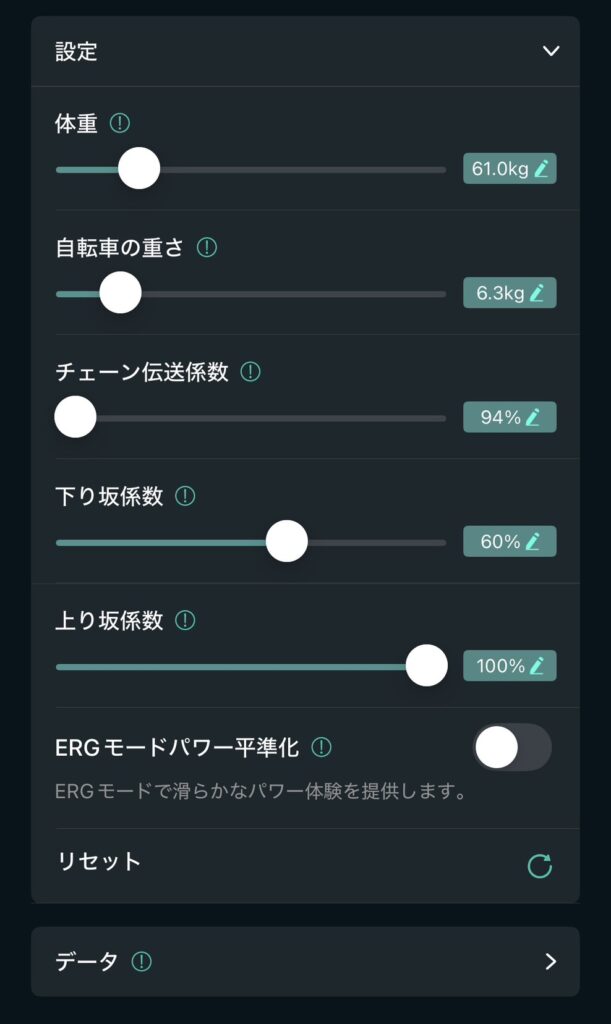ZWIFT内の勾配(下り・上り)でどれだけ負荷を上下させるかのデータはZWIFT側から送られますが、そのデータを何パーセントで反映させるかをそれぞれ設定できます。