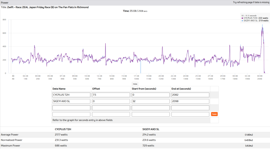 最初のデュアルレコード(Zeal Japan Friyday Race(B))ではわかりませんでしたが、低出力域は逆に上ブレしていることが確認できました。