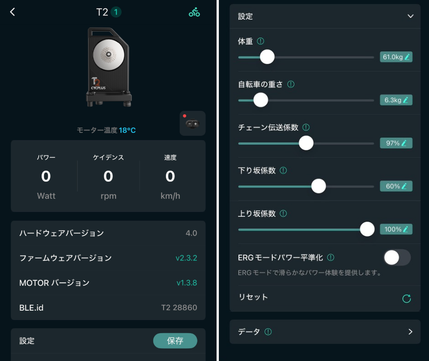 上の接続と設定で書きましたが、CYCPLUSのスマートローラーはアプリにチェーン伝達係数という項目があります。