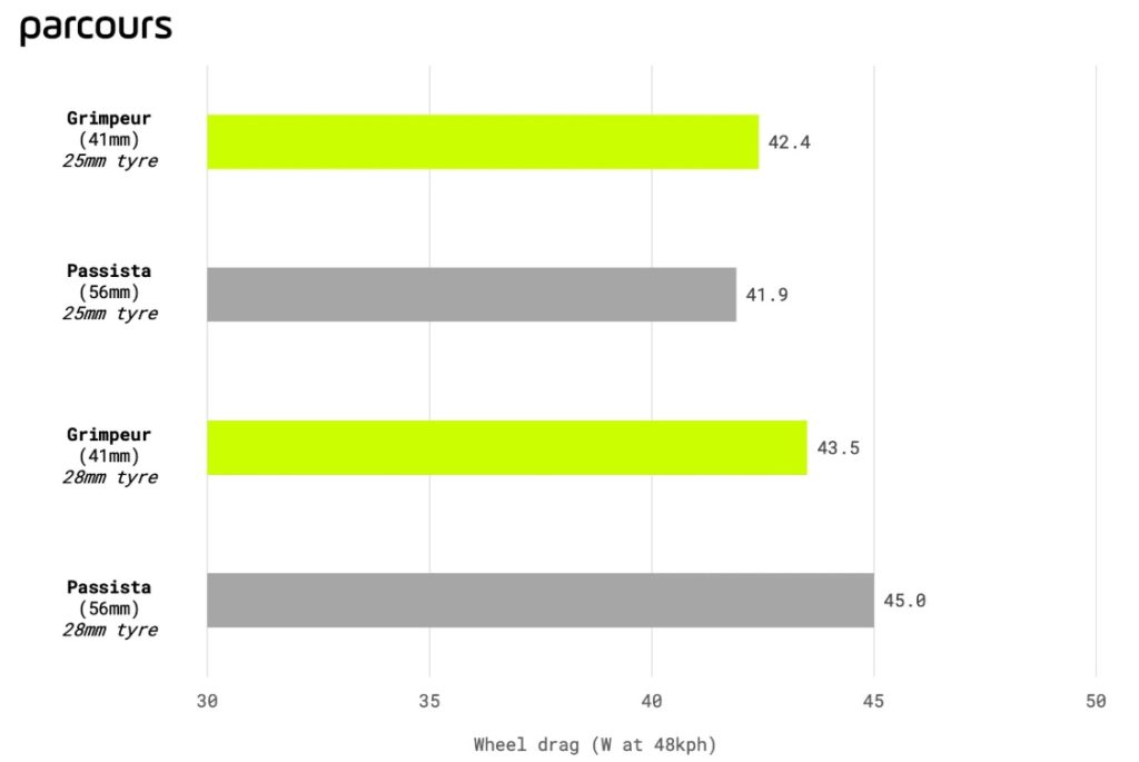 GLIMPEUR41mmはPassistaと比較してリム高が15mm低いにもかかわらず25mmタイヤ装着時で0.5W差に肉薄、28mmタイヤ装着時では1.5W上回っています
