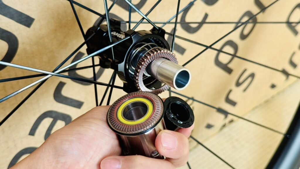 フリーは工具無しで手で引っ張ると外せるシンプルなもの、中のセラミックベアリングのレースは黄色でした。