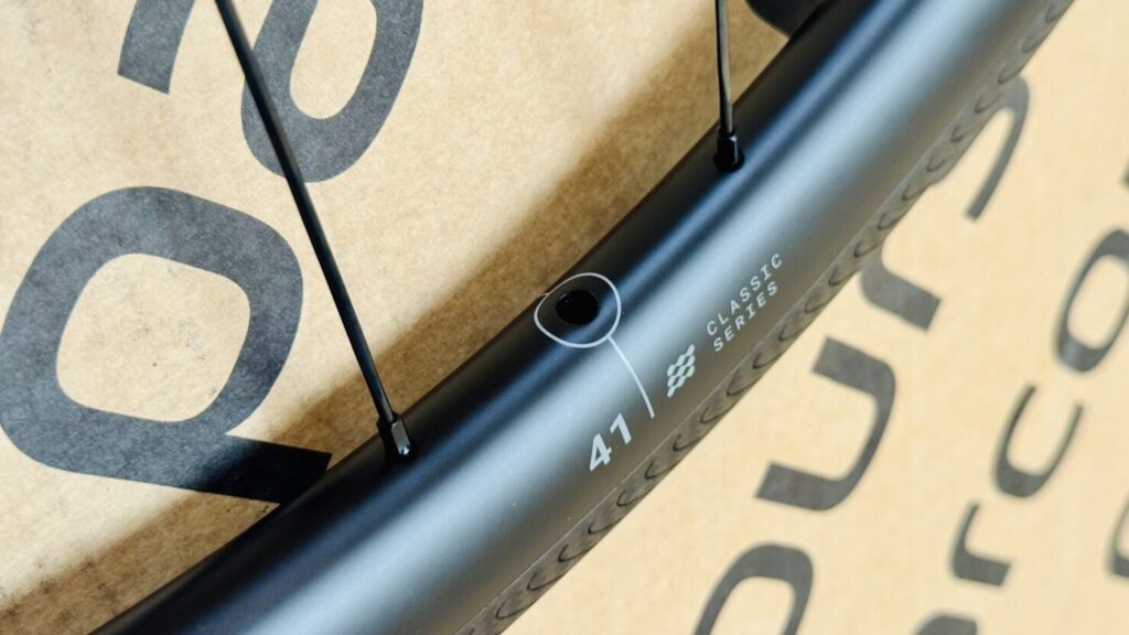 バルブホール部は細いラインとリムハイトである「41」の数字、パルクールのロゴ、CLASSIC SERIES(?)がグレーがかった白でプリントされておりアクセントとなっています。