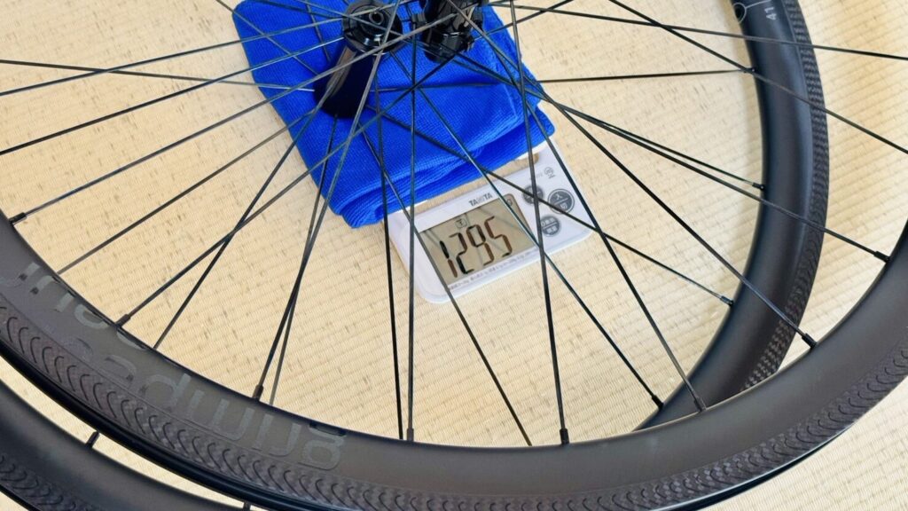 今は1000gを切るホイールもあるので突出した軽さではないですが、今まで使っていたElite Wheels Drive 40V(実測1273g)とほとんど変わらない軽さなのは嬉しいところです。