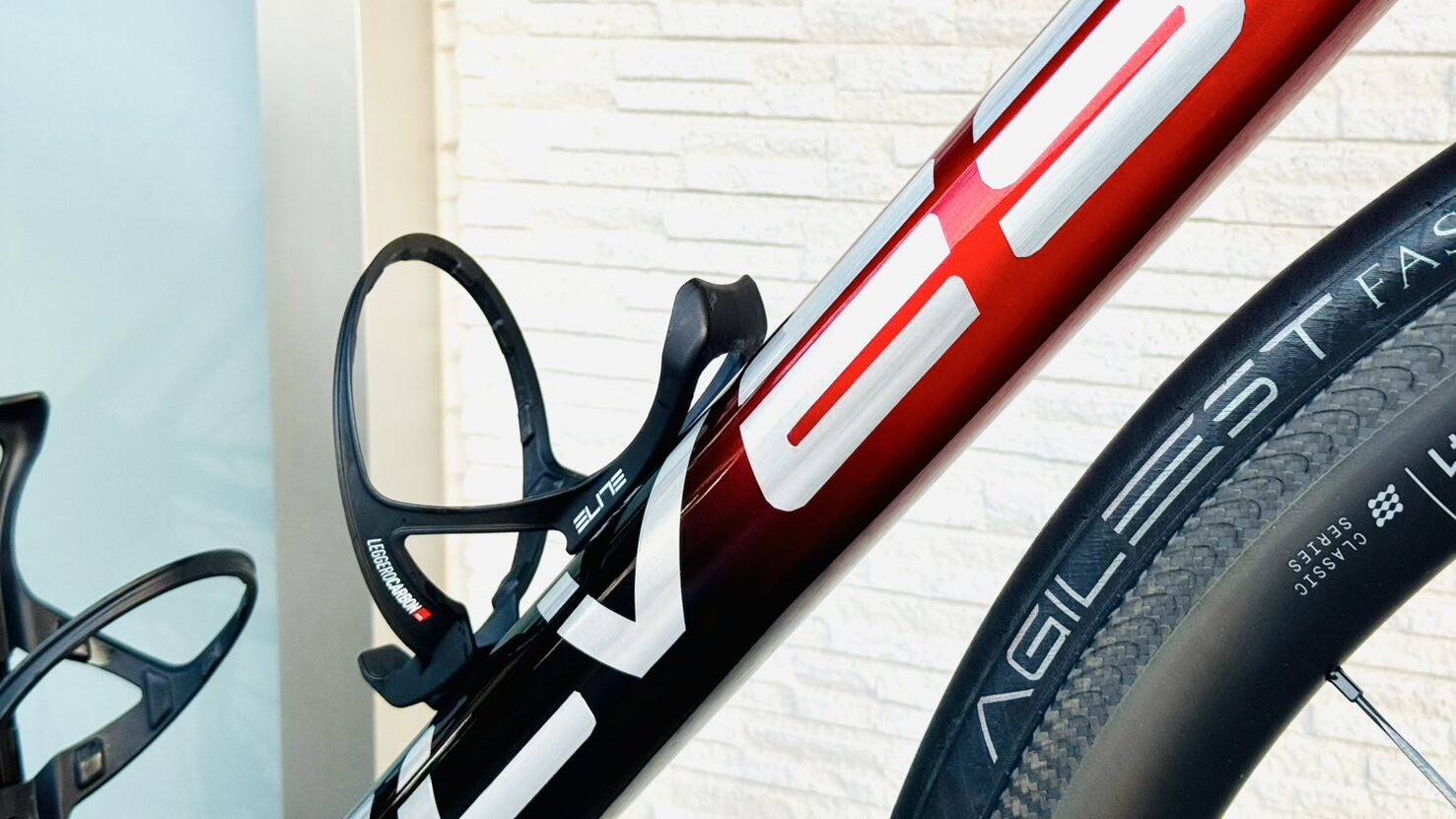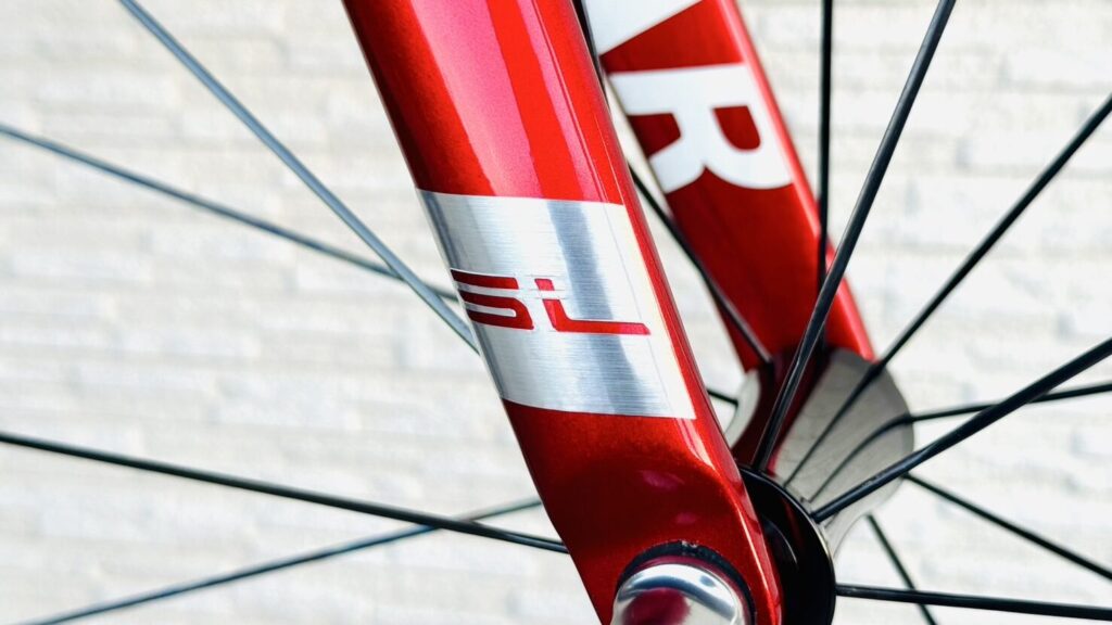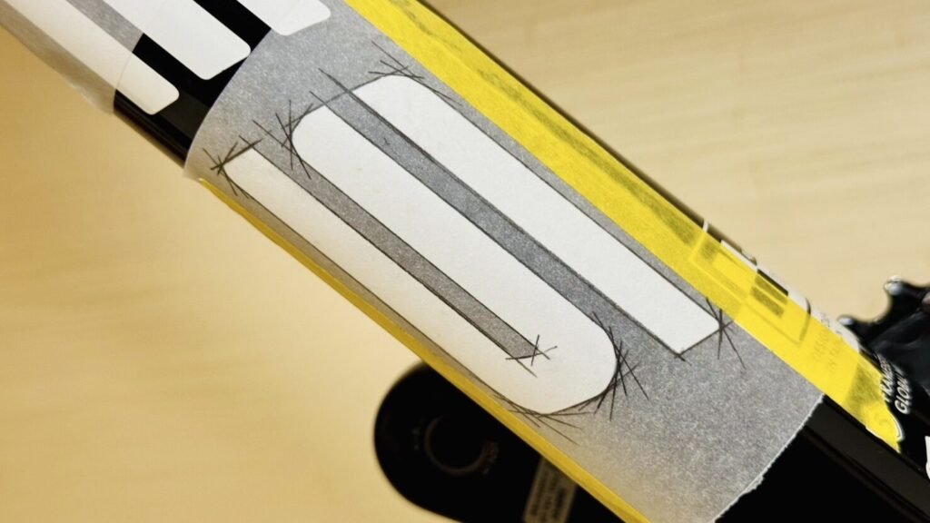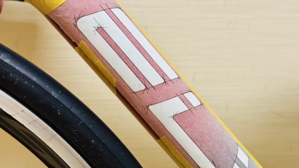 今回はダウンチューブとフォークのロゴを白からメタリック(ヘアライン)のロゴに変更します。