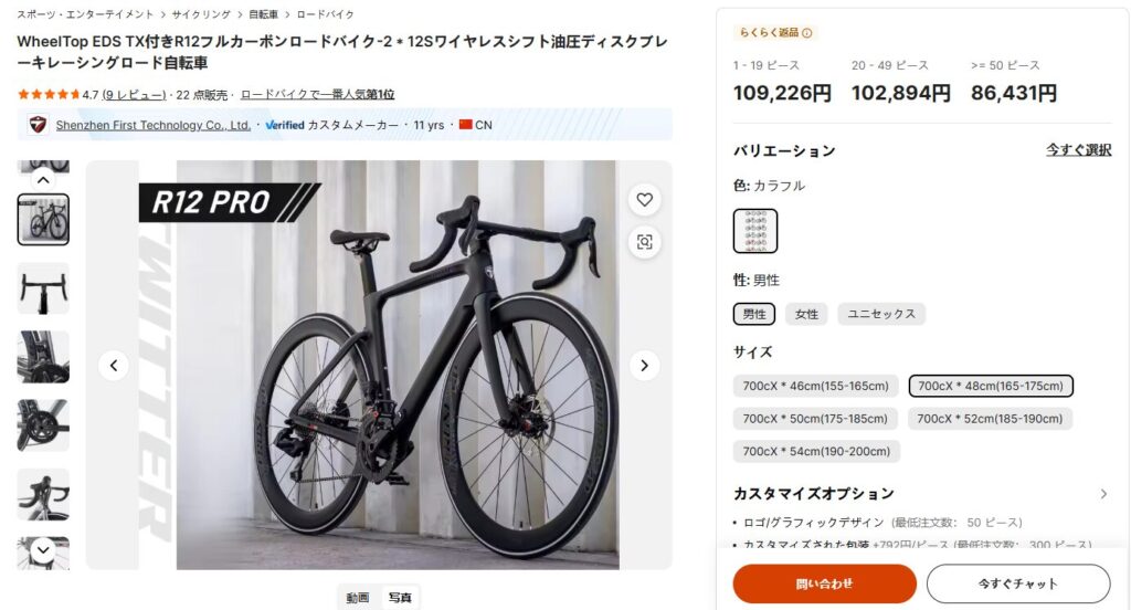 ロードバイク関連商品はあまり見つけられませんが、WheelTop EDS TX付き 油圧ディスクブレーキ12速フルカーボンロードバイクが11万円で注文できたり色々探すと面白そうです。(105Di2のバイクもあります)