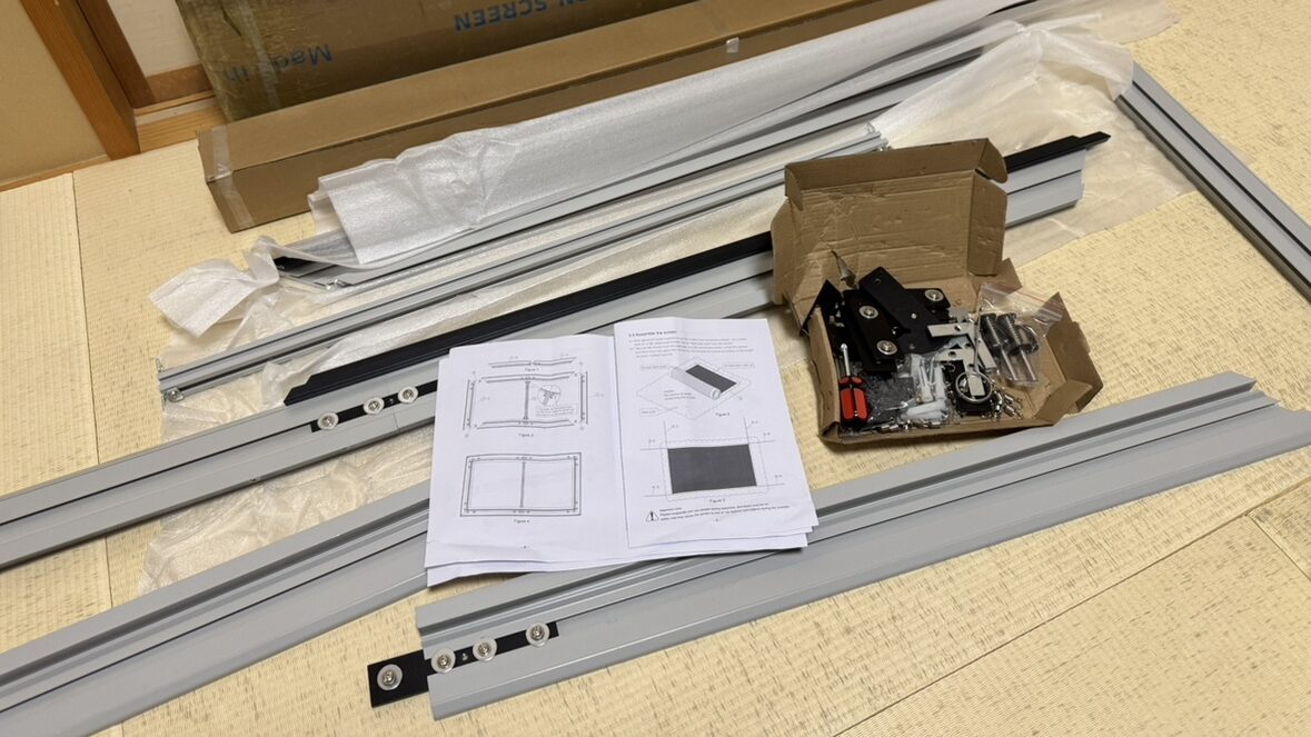 塗料が乾いたらつっぱってスクリーン取付金具を取り付けて完成です。