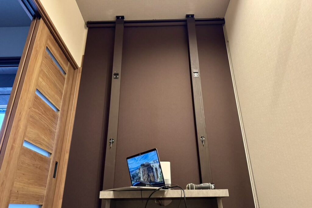 奥のロールスクリーンは遮光性で室内は暗くできるよ。