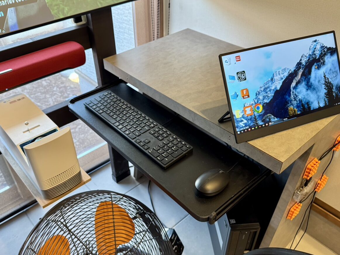 デスク下には新たにスライド式キーボードトレイを設置。