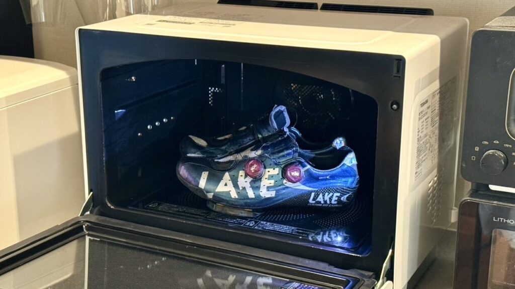次に2分湯煎してふにゃふにゃになったインソールをシューズへ挿入、脚を入れて6~8分固まるを待つだけです。