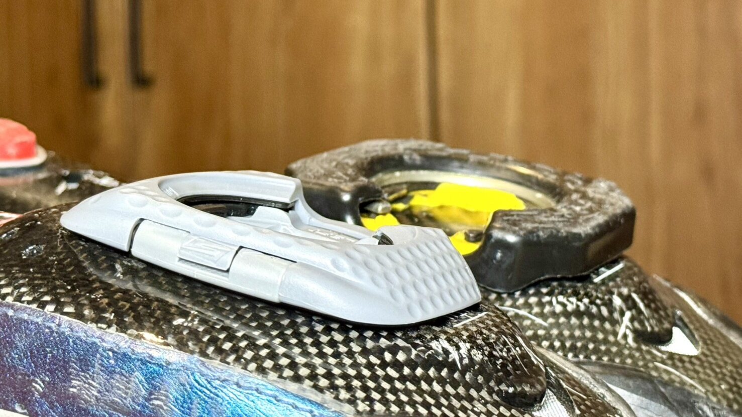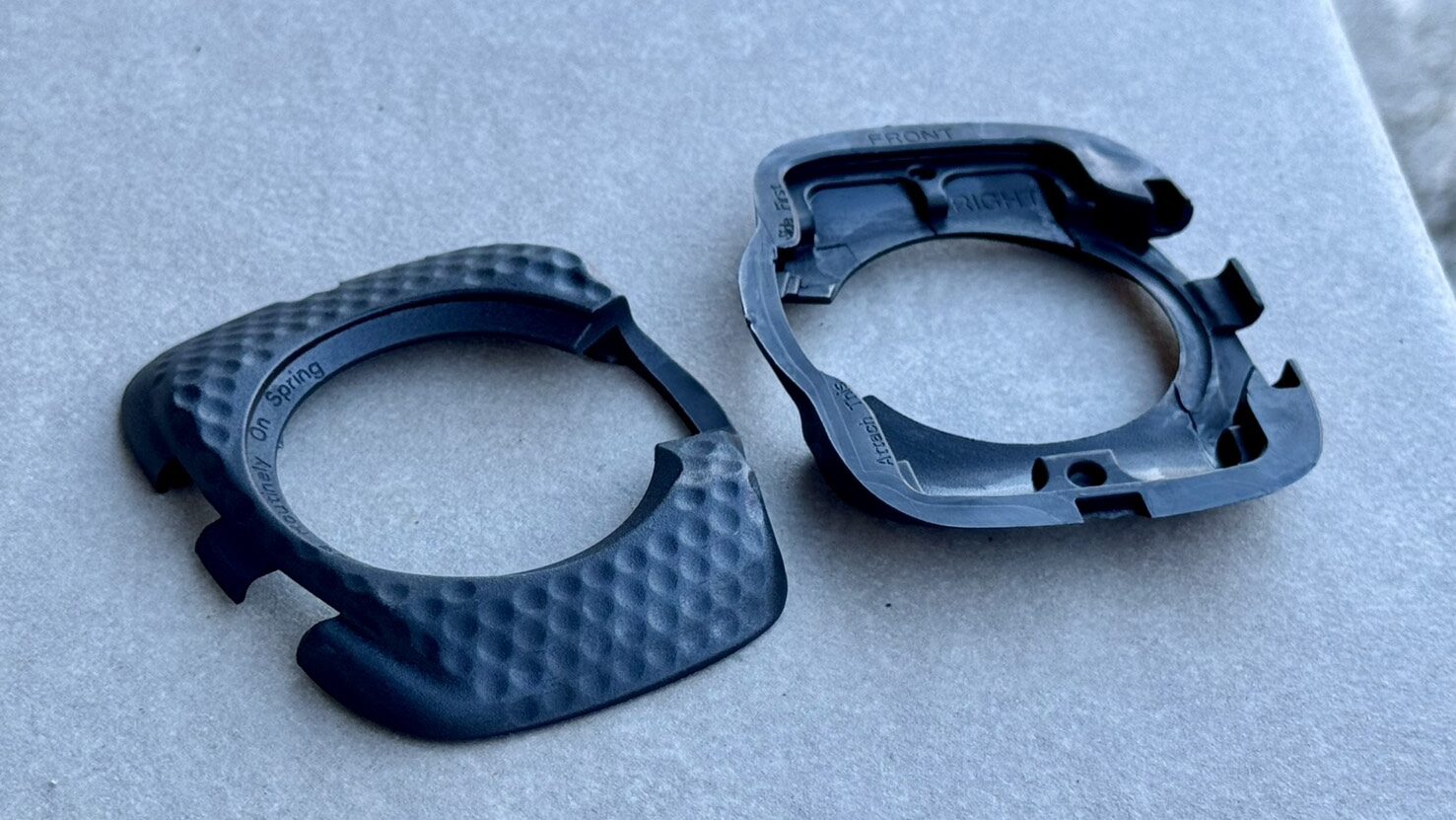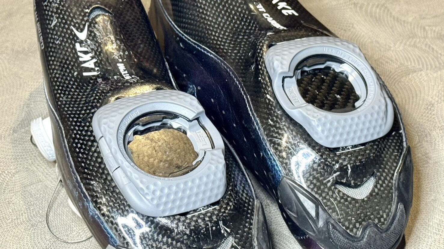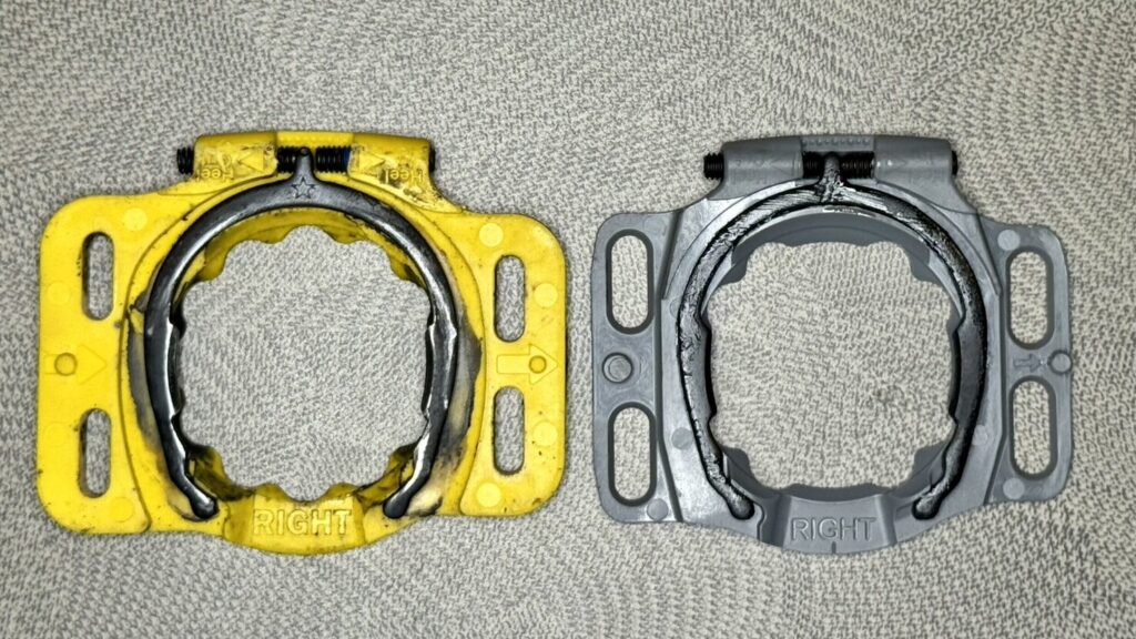 おろしたてだったクリートカバーが片足だけになりショックを受ける中、原因はクリートウェッジが潰れ、クリートが弓なりに反ってしまっていたことだと解りました。
