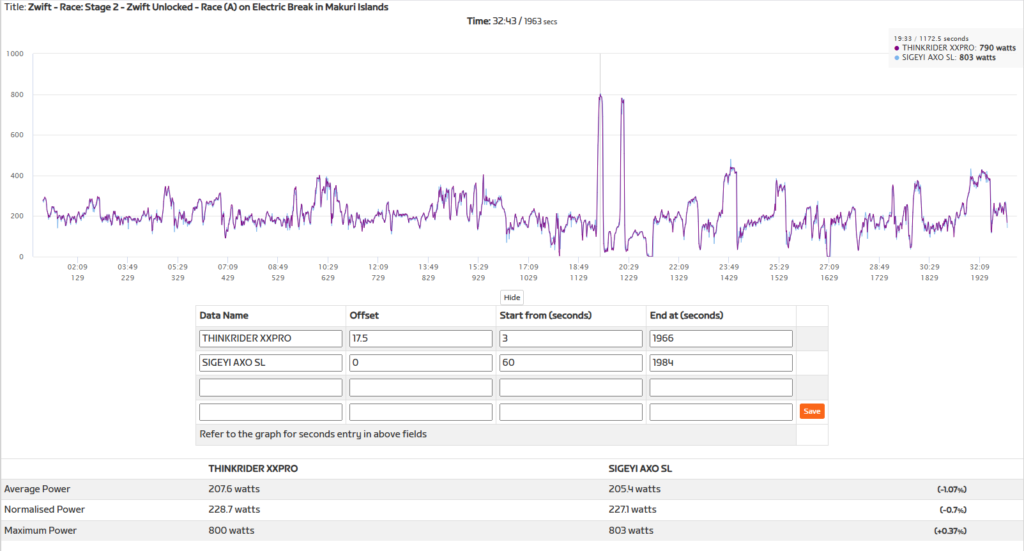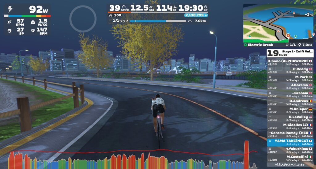 だいたい14.5W/kg(870W)くらいで発生し、ケイデンスを上げて補いますが13.0W/kg(780W)くらいに下がってしまいます。