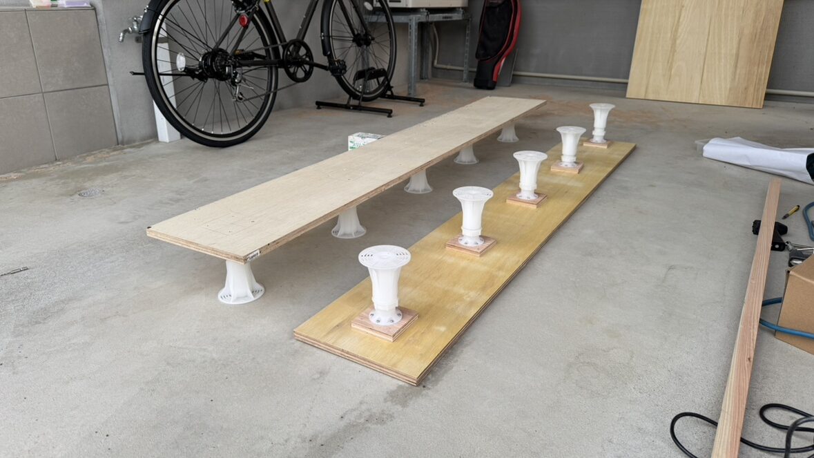 土間との高さと水平調整にはプラ木レンという調整器具を使います。(モノタロウで購入)