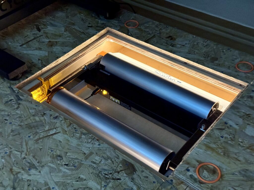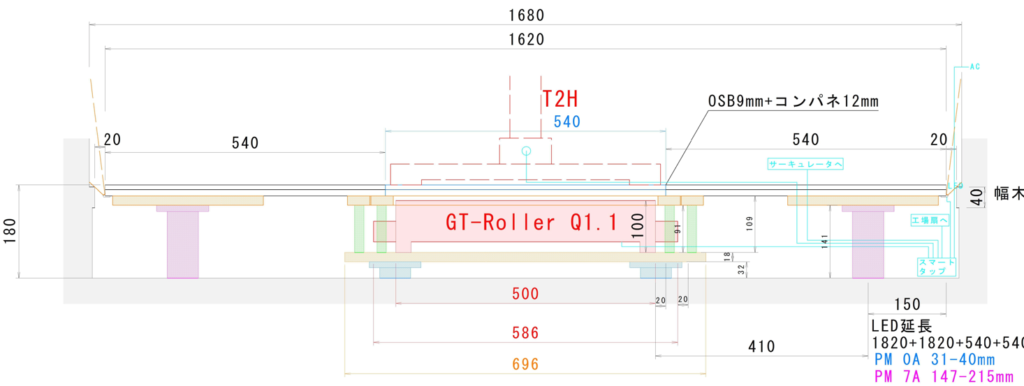 LEDテープをコーナーレールに貼り付けて床の両側・4本ローラーの内部3箇所に貼り付けました。